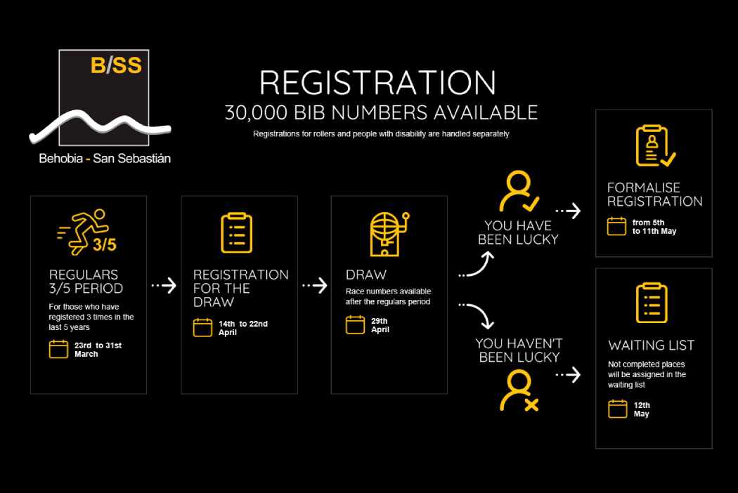 Registration for the race number draw for the 61st edition of the Behobia - San Sebastián will be open for 8 days, from 14 April 2026 at 12:00 noon until 22 April at 11:59 p.m. All numbers have the same chance of being selected in the draw, irrespective of when they register for the process.