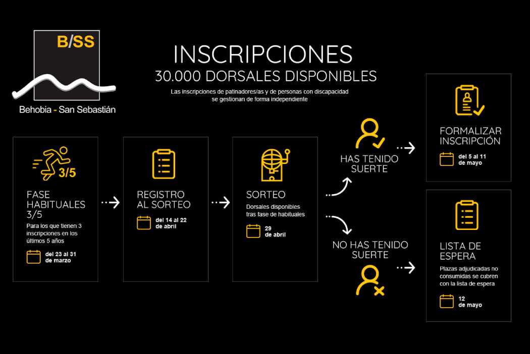 El registro al sorteo de dorsales para la edición 61 de la Behobia - San Sebastián se abrirá durante 8 días, desde el 14 de abril de 2026 a las 12:00 horas hasta el 22 de abril a las 23:59 horas. La probabilidad de que un número sea agraciado en el sorteo es la misma independientemente del día en que se realice el registro al sorteo.